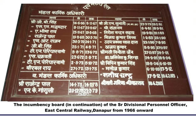 From the post of Sr Divisional Engineer/Mughalsarai I was transferred and posted as Sr Divisional Personnel Officer/Danapur. (Sr DPO/DNR) in 1981.The old incumbency board displayed in the chamber showed that it all started with the designation of ‘Superintendent Staff’ when the division came into being on the 1st January 1925. Subsequently the post was designated as ‘Divisional Personnel Officer’ and upgraded as ‘Sr DPO’ in 1975.